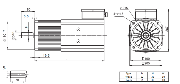 Flame size 190mm Model RatedTorqueRatedVoltageRatedSpeedRatedPowerRatedCurrentKt Ke Max.SpeedMax.TorqueRotorInertiaPoles Weight Length Length(with braker)N.m Vac rpm kW A N.m/A V/krpm rpm N.m Kg.cm² poles Kg mm mm 190H11D30C 35 380 3000 11.0 25.4 1.6 95 3600 105 68 10 30 341 441 190H11D20C 50 380 2000 11.0 24.8 2.4 144 2500 158 89 10 33 381 441 190H11D15C 70 380 1500 11.0 26.8 2.9 176 2000 210 95 10 34 381 441 190H13D17C 70 380 1700 12.5 30.2 2.6 156 2210 210 95 10 34 381 441 190H15D20C 72 380 2000 15.0 33.7 2.4 144 2500 210 130 10 37 441 496 190H22D30C 70 380 3000 20.0 48.4 1.6 99 3600 210 130 10 37 441 496 190H15D15C 96 380 1500 15.0 32.0 2.8 171 2000 288 130 10 39 441 496 190H17D17C 96 380 1700 17.0 37.5 2.8 172 2210 288 130 10 39 441 496 190H20D20C 96 380 2000 20.0 43.0 2.4 147 2500 288 130 10 39 441 496 190H19D15C 118 380 1500 18.5 40.0 3.2 195 2000 354 145 10 41 456 516 190H21D17C 118 380 1700 21.0 45.0 2.9 173 2210 354 145 10 41 456 516 190H25D20C 118 380 2000 25.0 56.0 2.3 141 2500 354 145 10 41 456 516 190H22D15C 140 380 1500 22.0 48.0 3.2 195 2000 420 172 10 45 496 556 190H25D17C 140 380 1700 25.0 55.0 2.8 169 2210 420 172 10 45 496 556 190H29D20C 140 380 2000 29.0 65.0 2.4 143 2500 420 172 10 45 496 556 电机绝缘等级:H 热保护:PT100,KTY可选 防护等级:IP65(风罩部分除外) 接线方式:航空插头或接线盒 冷却方式:风冷 风扇电压220V 工作制:S1 【V2.0】